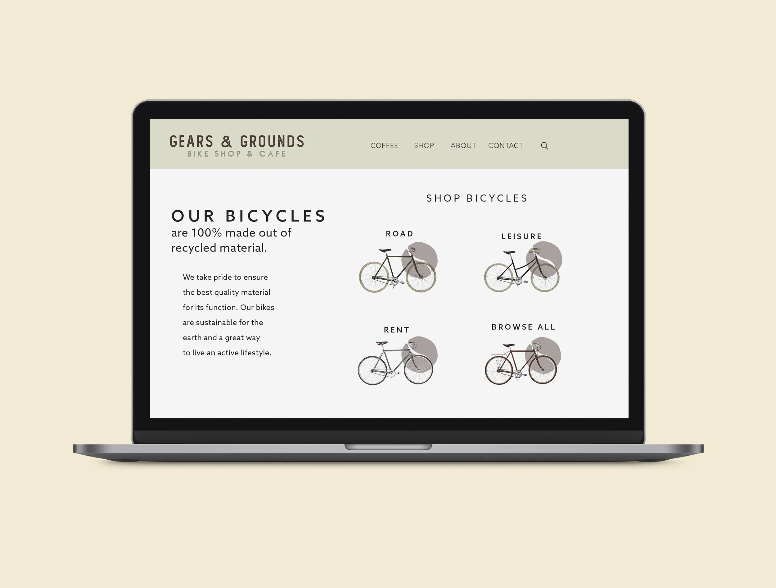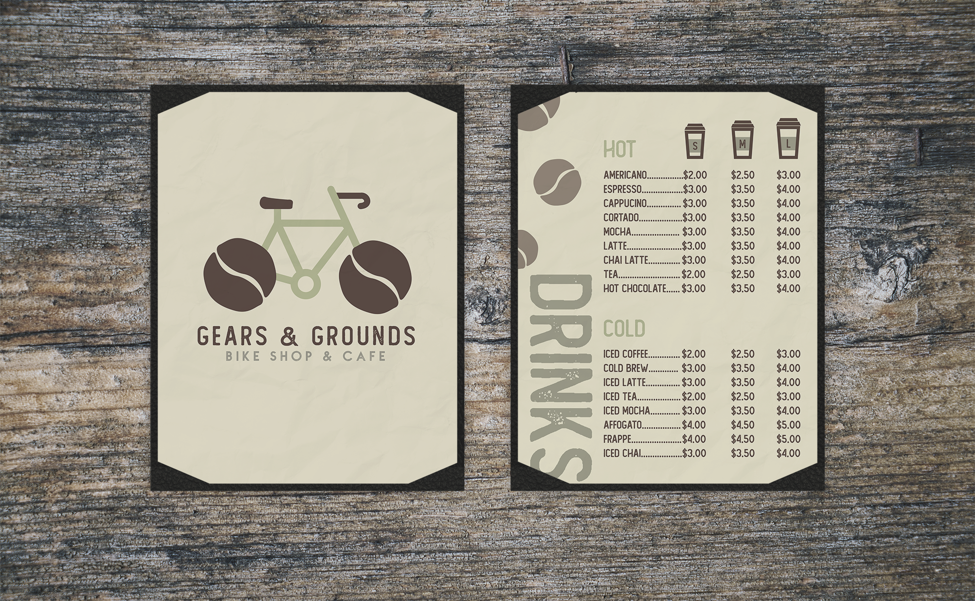 I worked with a team of three other students to create and market for a fictional company. We created a bike store and cafe called Gears and Grounds, and designed mockups of their menu and website.